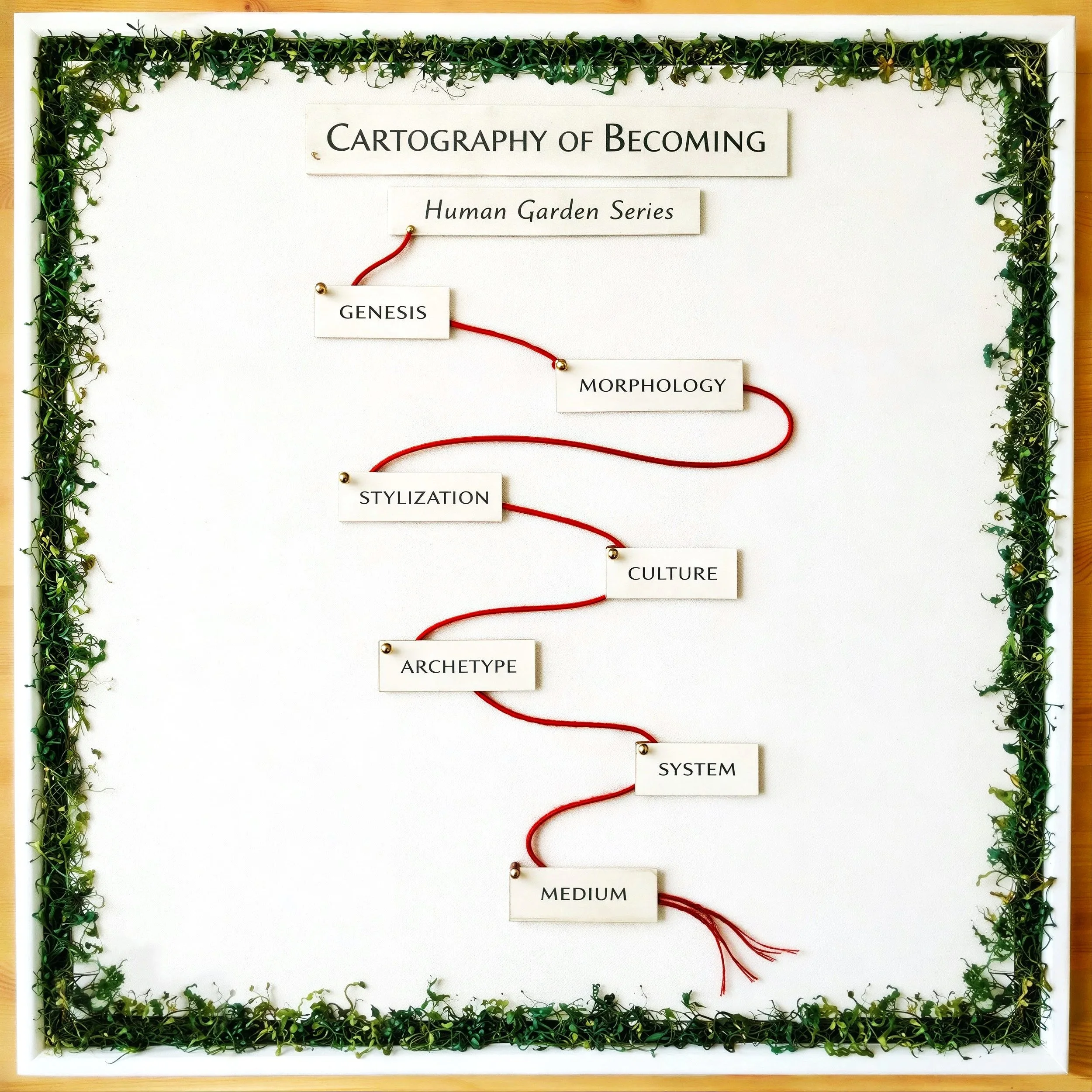 Each work functions simultaneously as an independent image and as a coordinate within a larger conceptual map. Across a series, these works form an interconnected structure — an emotional and symbolic cartography expanding from the inner human landscape toward collective and territorial identity.